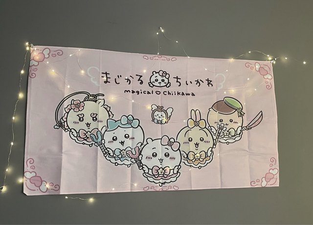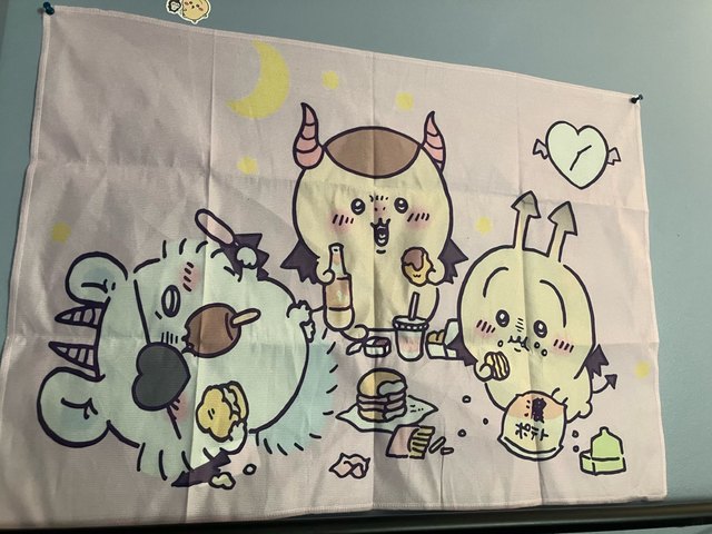 想像より大きめのタペストリー来て部屋の壁に貼ってみたけど可愛すぎる🫶推しのモモンガが飾れるなんて最高!他の種類も欲しいくらい!飾る用のフックとかもついてくるからすぐに飾れるしいい🥺扉の上のスペースにシンデレラフィットだった🤗